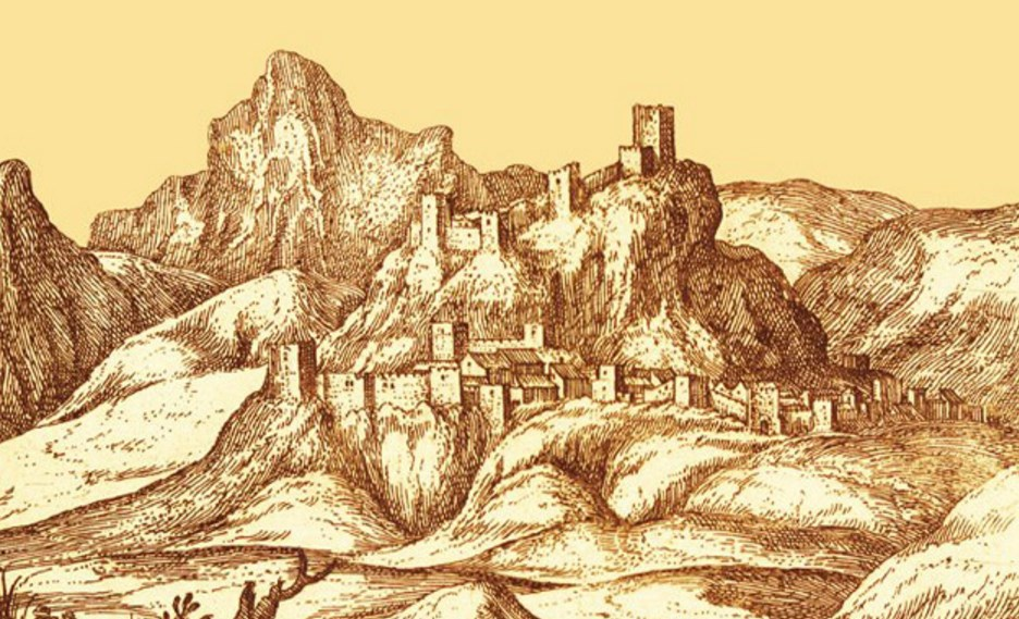 La población tenia una sola puerta, la cual miraba a poniente, y estaba defendida con sus torres y almenas. La única subida a este empinado castillo, era por un sendero cortado en la misma roca, y tan fragoso en algunas partes, que parecía una escalera desmoronada.